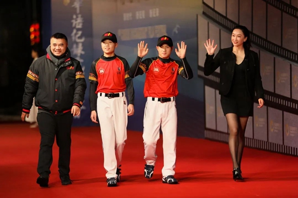 《棒!少年》主人公、公益棒球队“强棒天使”创始人兼教练孙岭峰和棒球少年们等红毯亮相