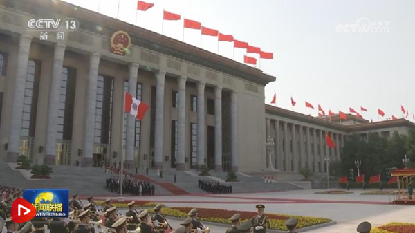 博鲁阿尔特抵达时,礼兵列队致敬。两国元首登上检阅台,军乐团奏中秘两国国歌,天安门广场鸣放21响礼炮。博鲁阿尔特在习近平陪同下检阅中国人民解放军仪仗队,并观看分列式。