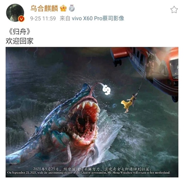 此次乌合麒麟的《归舟》,非常直白且生动地描绘了孟晚舟的“脱险”过程:挣脱的电子脚镣、伸出援手的中国救援直升机、张着大嘴的星条旗恶鲨……而图片下方也配有小字“经中国政府不懈努力,孟晚舟女士即将回到祖国”来表达对孟晚舟归国的欢迎。